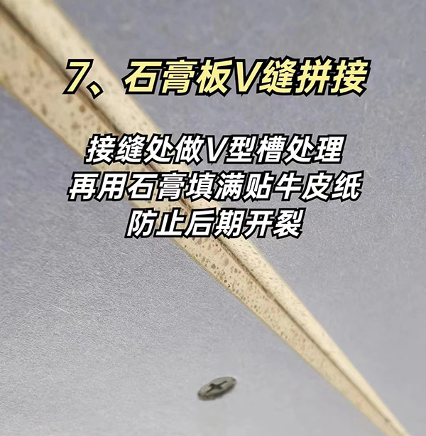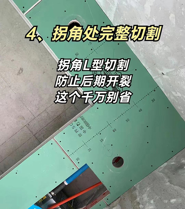 而在石膏板有邊頂的情況下,我們要求是底托上,就算發生開裂也是側面開裂,不是底面開裂。包括7字型拐角處,我們也是要求使用一整張石膏板進行切割,沒有接口,更大程度降低開裂的風險。